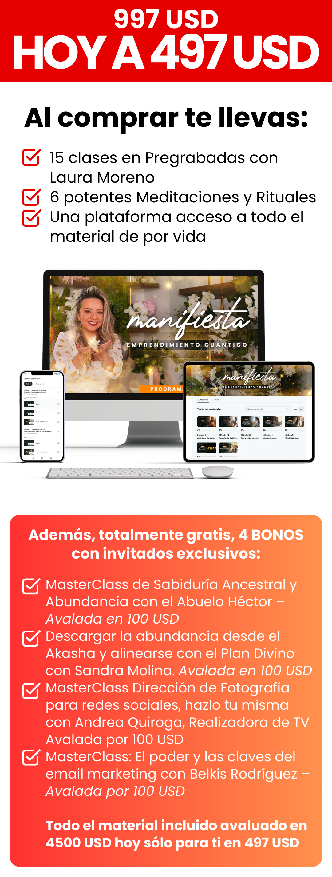 MANIFIESTA: Emprendimiento Cuántico es un programa formativo y experiencial híbrido con clases pregrabadas y en vivo, guiado por Laura Moreno y su equipo, diseñado para integrar física Cuántica, espiritualidad y sabiduría ancestral en un método único para manifestar y enseñar transformación.
